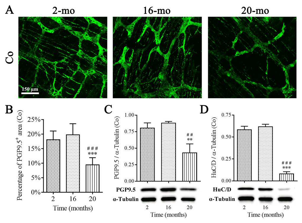 Furthermore, the total enteric neurons were evaluated by pan-neuronal markers protein gene product 9.5 (PGP9.5) and human neuronal protein HuC/HuD (HuC/D) immunostaining and western blotting, as observed in young (2-mo-old) and old (16-, 20-mo-old) mouse colon. PGP9.5-positive MP including neurons and processes, as well as nerve fibers were well exhibited via immunofluorescence staining, and quantification of PGP9.5(+) area per field did not show significant reduction until 20 mo, matching results obtained from the test of ChAT- and NOS-positive MP (Fig. 5A-B). Western blot analysis on PGP9.5 (Fig. 5C) and HuC/D (Fig. 5D) protein in colonic muscle layer containing MP showed the similar results.
