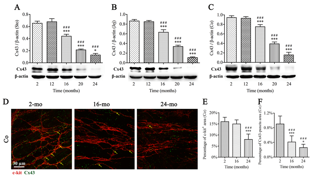 In conclusion, we demonstrated that reduction in numbers of ICCs and enteric neurons first appeared in stomach and then in intestine, suggesting that stomach was the first impaired organ during aging process and this might explain common gastric motor dysfunction in the elderly. Importantly, the decrease in Cx43 expression occurred prior to the decline in ICCs and ENS neurons in aged GI tract, was likely to be involved in mediating earlier dysmotility, providing possible therapeutic time window for beneficial intervention for geriatric patients with GI dysfunction in clinic. Furthermore, with time, “inflammaging” in the ENS microenvironment would contribute to ICCs and neurons loss and development of GI disorders.