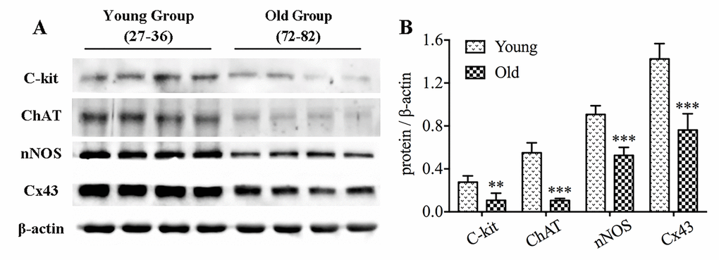 To clarify differences of ICCs, enteric neurons and Cx43 between young and old cohorts, we collected 8 samples of normal colonic muscle layer, four each from young group (27-36 years old) and old group (72-82 years old). Age-related changes in protein expressions were measured by western blotting (Fig. 7). It was clearly seen that c-kit and ChAT were significantly reduced in old people. Simultaneously, nNOS and Cx43 were also shown to be down-expressed in elderly samples.