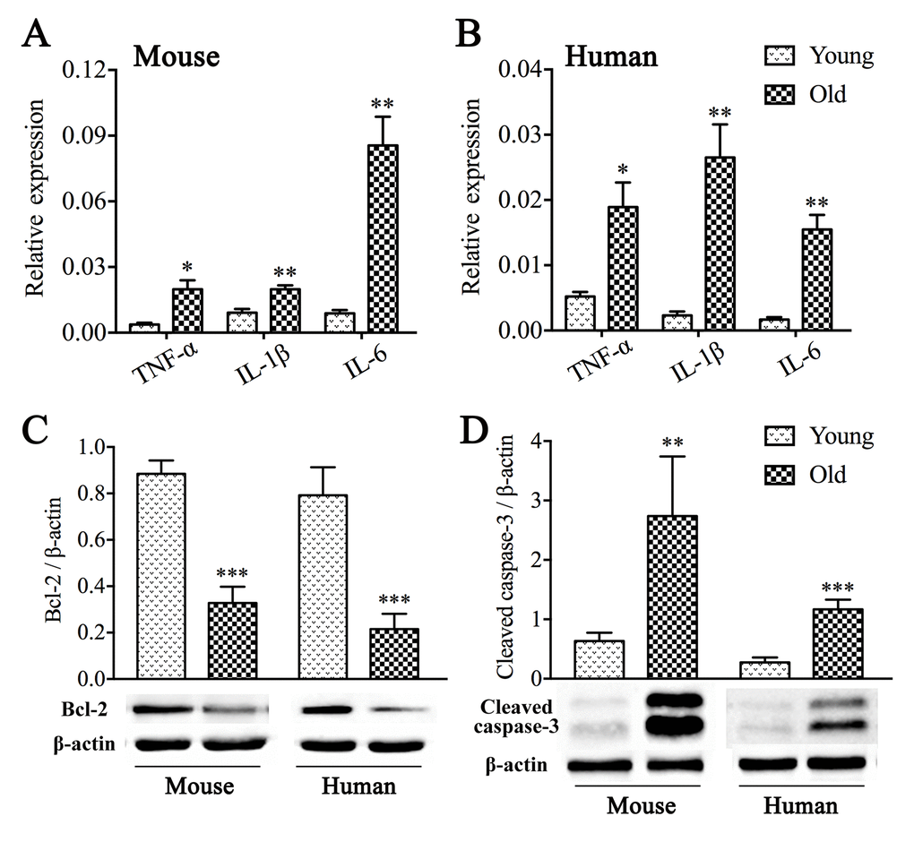 In order to explore mechanisms involved in aging that cause the loss of ICCs and enteric neurons, we performed mRNA expression analysis of classic pro-inflammatory cytokines including tumour necrosis factor-α (TNF-α), interleukin (IL)-1β and IL-6. A statistically significant rise in overall pro-inflammatory cytokines was found both in aged mice (Fig. 8A) and geriatric people (Fig. 8B) compared with young. We further investigated the expression of key proteins related apoptosis in the colonic muscle layer. As shown in Fig. 8C-D, decreased B-cell lymphoma-2 (Bcl-2) and increased cleaved caspase-3 were observed in old compared to young group.