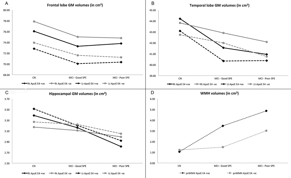 No significant differences between study conditions or (ApoE) polymorphism were found for GM volumes in the frontal lobe (Figure 3A) or temporal lobe (Figure 3B). There were study condition x ApoE status effects found for hippocampal GM and periventricular WMH (pvWMH) volumes. For hippocampal volumes in ApoE ε4 carriers, bilateral volumes were significantly lower in Poor SPE participants (p=0.001 for right, p=0.001 for left) and left hippocampus in Good SPE participants (p=0.096 for right, p=0.023 for left) compared to CN participants. In ApoE ε4 non-carriers, bilateral hippocampal volumes were lower in Poor SPE participants compared to CN (p=0.042 for right, p=0.012 for left), and hippocampal volumes did not differ between Good SPE and CN participants (p=0.259 for right p=0.516 for left) (Figure 3C). For pvWMH, volumes were significantly greater in ApoE ε4 negative Poor SPE participants compared to CN (p=0.002), but not for Good SPE participants (p=0.947) compared to CN. In ApoE ε4 carriers, pvWMH volumes in both Good SPE and Poor SPE were greater than CN, but this did not reach statistical significance (p=0.153 for Good SPE vs. CN; p=0.089 for Poor SPE vs. CN) (Figure 3D).