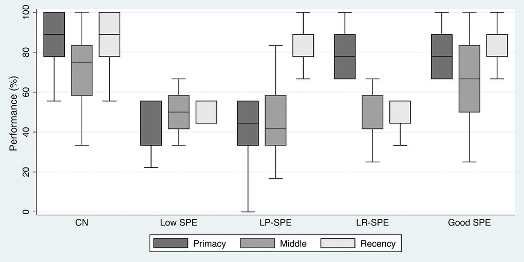Of the Poor SPE participants, 14 (11.8% of all MCI participants) were classified as Low SPE, 25 (21.0%) were low primacy only SPE (LP-SPE), and 13 (10.9%) were low recency only SPE (LR-SPE) (Figure 1). Checking the performance of the three SPE regions (primacy, middle, and recency) across the five groups showed results that corresponded to their classification criteria. Although the middle region was not used to classify participants and was not the focus of this analysis, it was noted that middle region performance was similar between CN and Good SPE participants, and between Low SPE, LP-SPE, and LR-SPE. Also, even though CN participants were not selected based on their SPE performance, their performance in all three regions, including the middle region, was noted to be better than all other MCI groups (Figure 4).