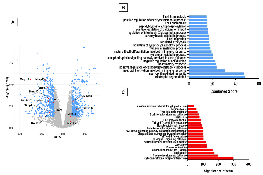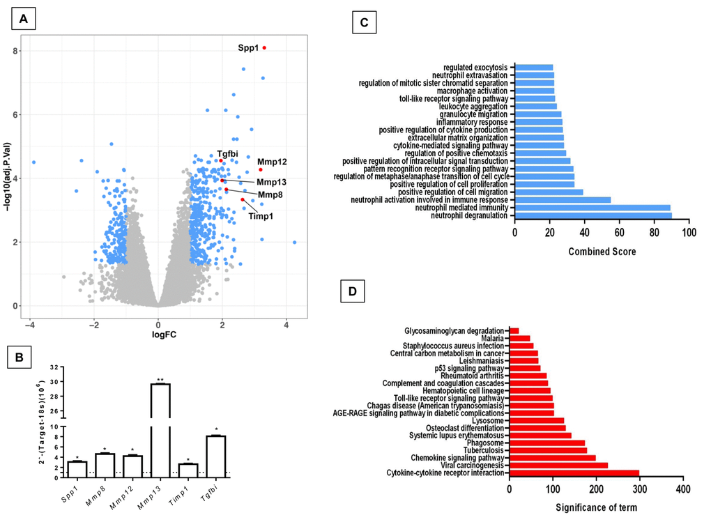 In order to know if there are differences in gene expression between the physiological and accelerated aging process induced by Zmpste24 deficiency, we performed a global gene expression analysis in lungs from young (4 weeks) and old (82 weeks) WT, and young (4 weeks) and old (16 weeks) Zmpste24 deficient mice [14]. As shown in the volcano plots, 576 genes were differentially expressed in old WT compared with their young counterpart (Figure 1A). The top 50 upregulated and downregulated genes are presented in Supplementary Table 1. The highest over-expressed gene in old WT lungs compared with young ones was the core Matrisome secreted phosphoprotein-1 (Spp1 also known as osteopontin). Tenascin C and transforming growth factor beta-induced (Tgf-βi) genes also belonging to the core Matrisome were highly upregulated. In addition, several matrix metalloproteinases considered as Matrisome-associated genes such as Mmp8, Mmp12, Mmp13, and Timp1 were also upregulated. Some of these findings were validated by qPCR as shown in Figure 1B.