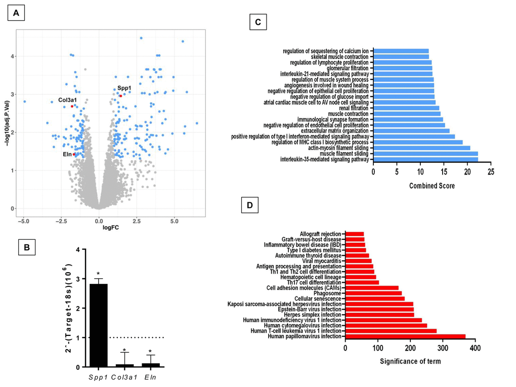 The comparison of lungs from young and old Zmpste24 deficient mice revealed 224 differentially expressed genes (Figure 2A). The top 50 upregulated and downregulated genes are shown in Supplementary Table 2. Several genes involved in the immune and inflammatory response, such as chemokines, chemokine receptors, and T-cell receptors were upregulated. As in WT old lungs, Spp1 was increased. Among the downregulated genes, we found several core Matrisome genes such as elastin (Eln), and collagen type 3 alpha-1 (Col3a1). These findings were confirmed by qPCR (Figure 2B). Functional analysis by GO and KEGG revealed pathways related to extracellular matrix organization, cell senescence, immune response, as well as several negative regulation pathways such as epithelia and endothelial cell proliferation (Figure 2C and 2D).
