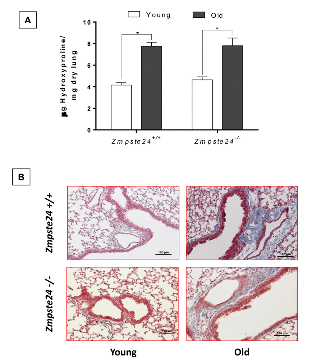 Aging increases lung collagen content in WT and Zmpste24-/- mice and localizes surrounding airways