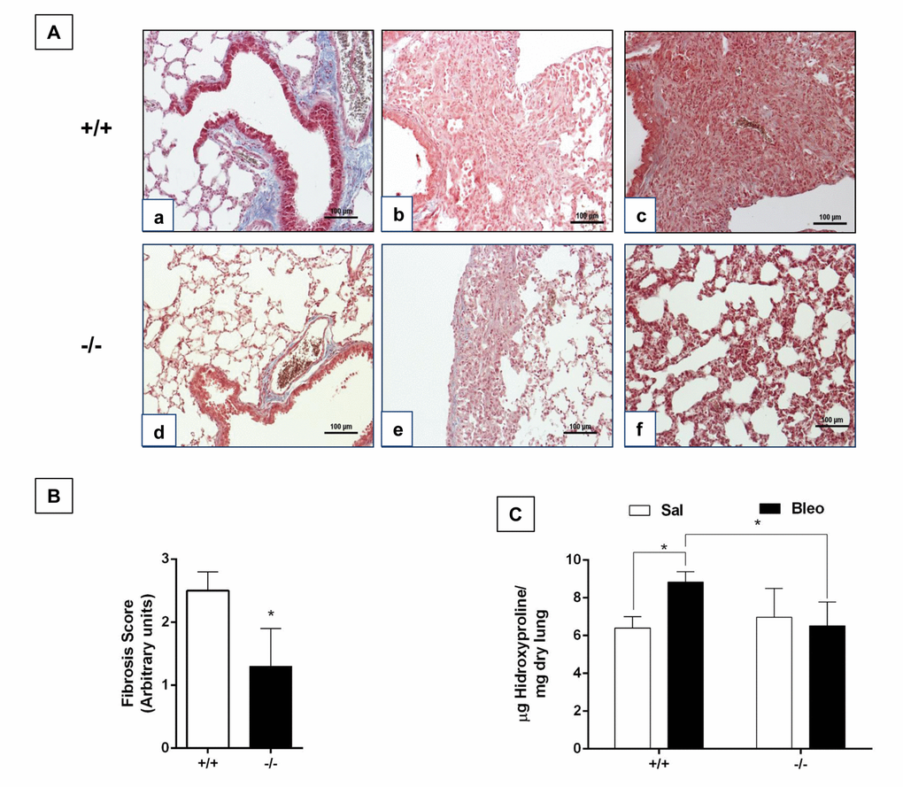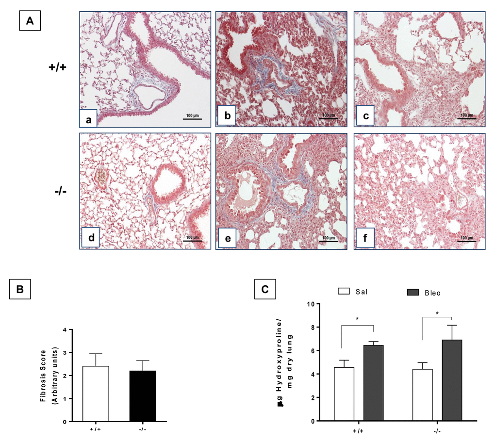 Jr . The determination of hydroxyproline in tissue and protein samples containing small proportions of this imino acid. Arch Biochem Biophys. 1961; 93:440–47. https://doi.org/10.1016/0003-9861(61)90291-0 [PubMed] - 40. Pardo A, Ruiz V, Arreola JL, Ramírez R, Cisneros-Lira J, Gaxiola M, Barrios R, Kala SV, Lieberman MW, Selman M. Bleomycin-induced pulmonary fibrosis is attenuated in gamma-glutamyl transpeptidase-deficient mice. Am J Respir Crit Care Med. 2003; 167:925–32. https://doi.org/10.1164/rccm.200209-1007OC [PubMed]