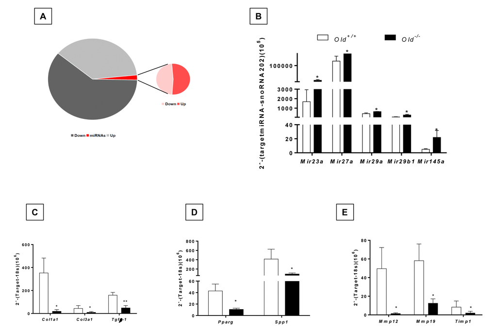 In the global RNA expression, we noticed that 42 microRNAs were differentially expressed, 22 upregulated and 20 down-regulated in the lungs from bleomycin injured Zmpste24 deficient mice compared with their WT counterpart (Figure 7A, Supplementary Table 5). Several of these microRNAs were of interest because their targets are related with the extracellular matrix such as miR23a, miR27a, miR29a, miR29b-1, miR491, and miR145a, which were validated by qPCR. These five miRNAs were increased during the fibrotic response in old Zmpste24 deficient mice (Figure 7B). The three members of the miR29 family (miR29a, miR29b-1, and miR29c) have been shown to target mRNAs of extracellular matrix proteins [16,17]. We found a downregulation of several miR29 targets in lungs from old Zmpste24 deficient mice such as Col1a1, Col3a1, and Tgfb-1, which were corroborated by qPCR (Figure 7C). As mentioned, miR27a was upregulated in the lungs of old Zmpste24 deficient mice after bleomycin injury. To investigate the role of this microRNA, we searched for targets in silico databases [18]. Matching with our results, we found two genes, Spp1, and Ppar-γ. That was downregulated in the lungs of old Zmpste24 deficient mice compared with their WT counterpart after bleomycin injury. These results were validated by qPCR (Figure 7D).