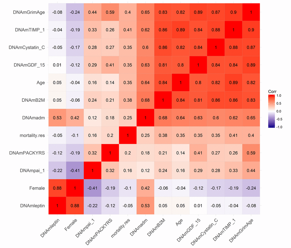 Figure 2. Heat map of pairwise correlations of DNAm based biomarkers. The heat map color-codes the pairwise Pearson correlations of select variables (surrounding the definition of DNAm GrimAge) in the test data from the Framingham Heart Study (N=625). DNAm GrimAge is defined as a linear combination of chronological age (Age), sex (Female takes on the value 1 for females and 0 otherwise), and eight DNAm-based surrogate markers for smoking pack-years (DNAm PACKYRS), adrenomedullin levels (DNAm ADM), beta-2 microglobulin (DNAm B2M), cystatin C (DNAm Cystatin C), growth differentiation factor 15 (DNAm GDF-15), leptin (DNAm Leptin), plasminogen activation inhibitor 1 (DNAm PAI-1), issue inhibitor metalloproteinase 1 (DNAm TIMP-1). The figure also includes an estimator of mortality risk, mortality.res, which can be interpreted as a measure of "excess" mortality risk compared to the baseline risk in the test data. Formally, mortality.res is defined as the deviance residual from a Cox regression model for time-to-death due to all-cause mortality. The rows and columns of the Figure are sorted according to a hierarchical clustering tree. The shades of color (blue, white, and red) visualize correlation values from -1 to 1. Each square reports a Pearson correlation coefficient.