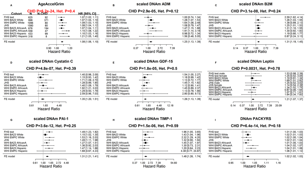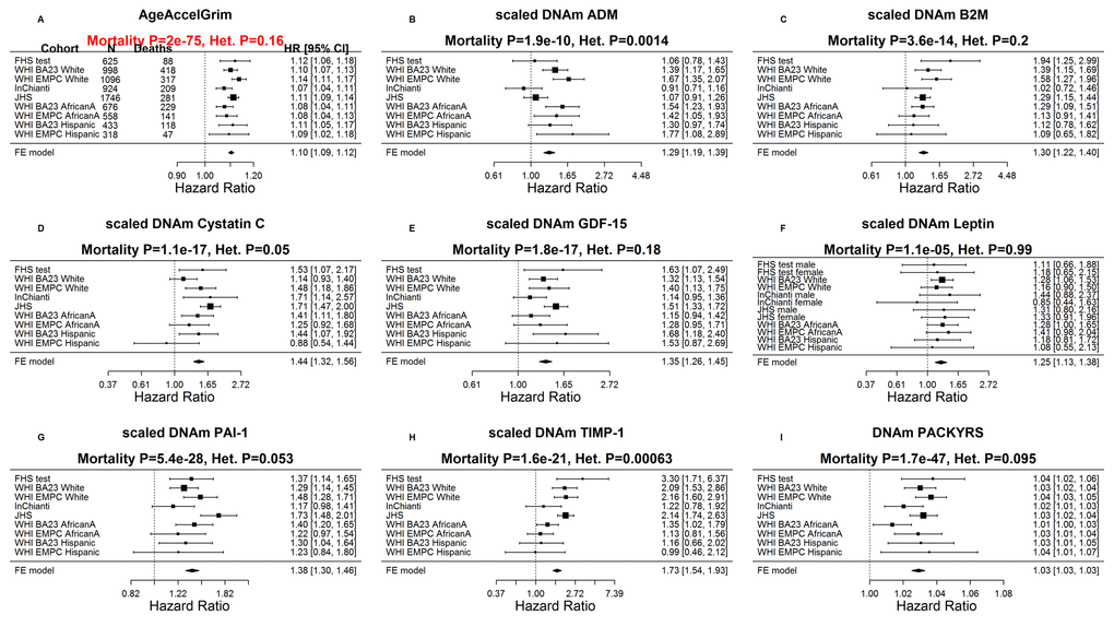 Figure 3. Meta analysis forest plots for predicting time-to-death due to all-cause mortality. Each panel reports a meta-analysis forest plot for combining hazard ratios predicting time-to-death based on a DNAm-based biomarker (reported in the figure heading) across different strata formed by racial group within cohort. (A) Results for AgeAccelGrim. Each row reports a hazard ratio (for time-to-death) and a 95% confidence interval resulting from a Cox regression model in each of 9 strata (defined by cohort and racial groups). Results for (age-adjusted) DNAm-based surrogate markers of (B) adrenomedullin (ADM), (C) beta-2 microglobulin (B2M), (D) cystatin C (Cystatin C), (E) growth differentiation factor 15 (GDF-15), (F) leptin, (G) plasminogen activation inhibitor 1 (PAI-1), (H) tissue inhibitor metalloproteinase 1 (TIMP-1) and (I) smoking pack-years (PACKYRS). The sub-title of each panel reports the meta-analysis p-value and a p-value for a test of heterogeneity Cochran Q test (Het.). (A) Each hazard ratio (HR) corresponds to a one-year increase in AgeAccelGrim. (B-H) Each hazard ratio corresponds to an increase in one-standard deviation. (I) Hazard ratios correspond to a 1 year increase in pack-years. The most significant meta-analysis P value (here AgeAccelGrim) is marked in red. A non-significant Cochran Q test p-value is desirable because it indicates that the hazard ratios do not differ significantly across the strata. For example, the hazard ratios associated with AgeAccelGrim exhibit insignificant heterogeneity across the strata (