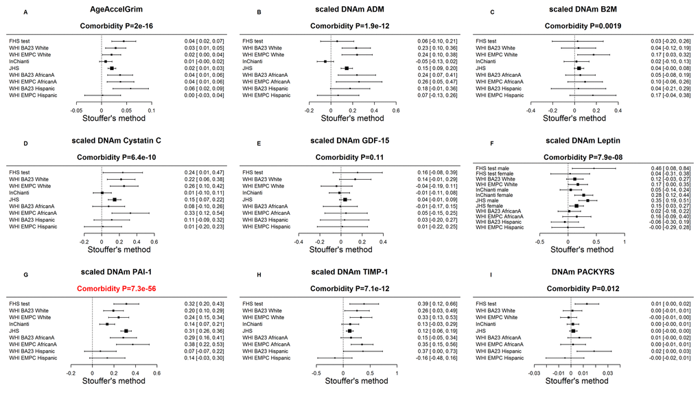 Figure 5. Meta-analysis of associations with total number of age-related conditions. Each panel reports a meta-analysis forest plot for combining regression coefficients between the comorbidity index and the DNAm-based biomarker (reported in the figure heading) across different strata, which are formed by racial group within cohort. (A) Meta analysis of the regression slope between AgeAccelGrim and the comorbidity index. Analogous results for (age-adjusted) DNAm based surrogate markers of (B) adrenomedullin (ADM), (C) beta-2 microglobulin (B2M), (D) cystatin C (Cystatin C), (E) growth differentiation factor 15 (GDF-15), (F) leptin, (G) plasminogen activation inhibitor 1 (PAI-1), (H) tissue inhibitor metalloproteinase 1 (TIMP-1) and (I) smoking pack-years (PACKYRS). The individual study results were combined using fixed effect meta-analysis (reported in the panel heading). Cochran Q test for heterogeneity across studies (Het.). The effect sizes correspond to one year of age acceleration in panel A, one pack-year in panel I and one standard deviation in other panels for DNAm proteins. The estimate with the most significant meta P value is marked in red.