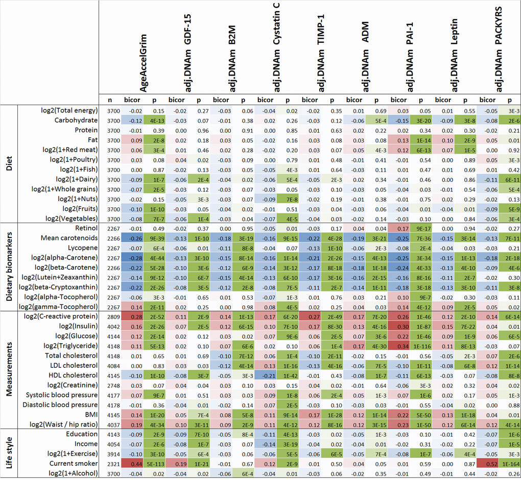 Figure 6. Cross sectional correlations between DNAm biomarkers and lifestyle factors. Robust correlation coefficients (biweight midcorrelation [62]) between 1) AgeAccelGrim and its eight age-adjusted underlying DNAm-based surrogate biomarkers and 2) 38 variables including self-reported diet, 9 dietary biomarkers, 12 variables related to metabolic traits and central adiposity, and 5 life style factors. The 2-color scale (blue to red) color-codes bicor correlation coefficients in the range [-1, 1]. The green color scale (light to dark) applied to unadjusted P values. The analysis was performed on the WHI cohort in up to 4200 postmenopausal women. An analogous analysis stratified by race/ethnicity can be found in Supplementary Fig. 30.