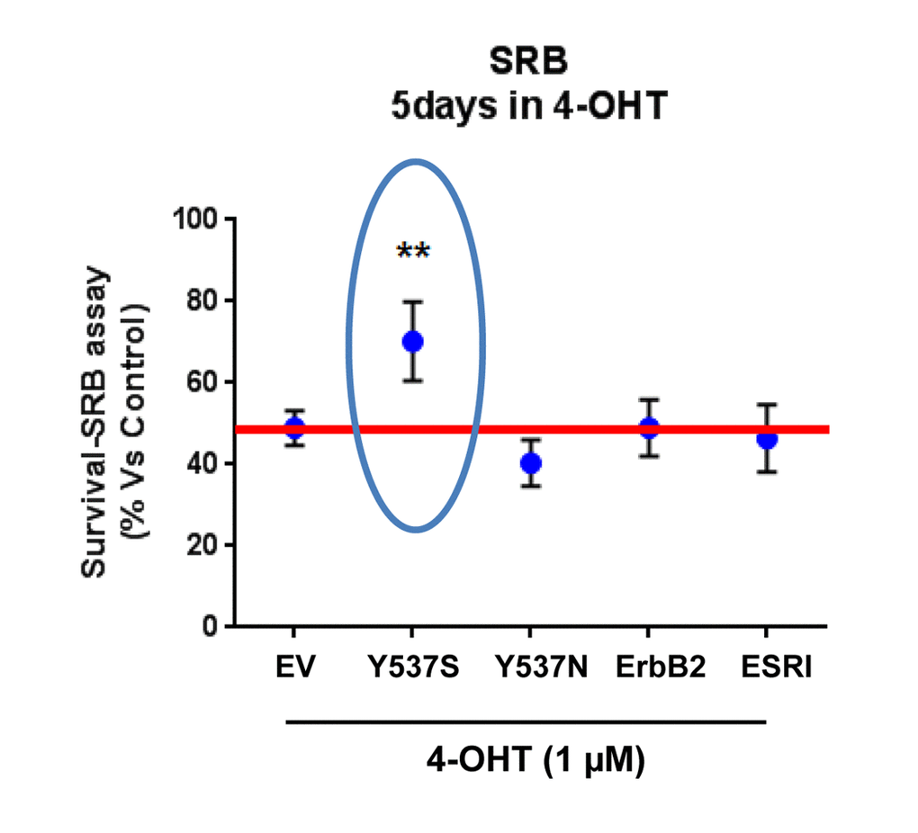 Somatic mutations in the estrogen receptor gene are specifically associated with the onset and development of hormone therapy resistance in human breast cancer patients [1,3,5]. In particular, the Y537S mutation drives endocrine resistance by maintaining the estrogen receptor in the constitutively activated state, resulting in an aggressive clinical phenotype, leading to tumor recurrence and distant metastasis [19,20].