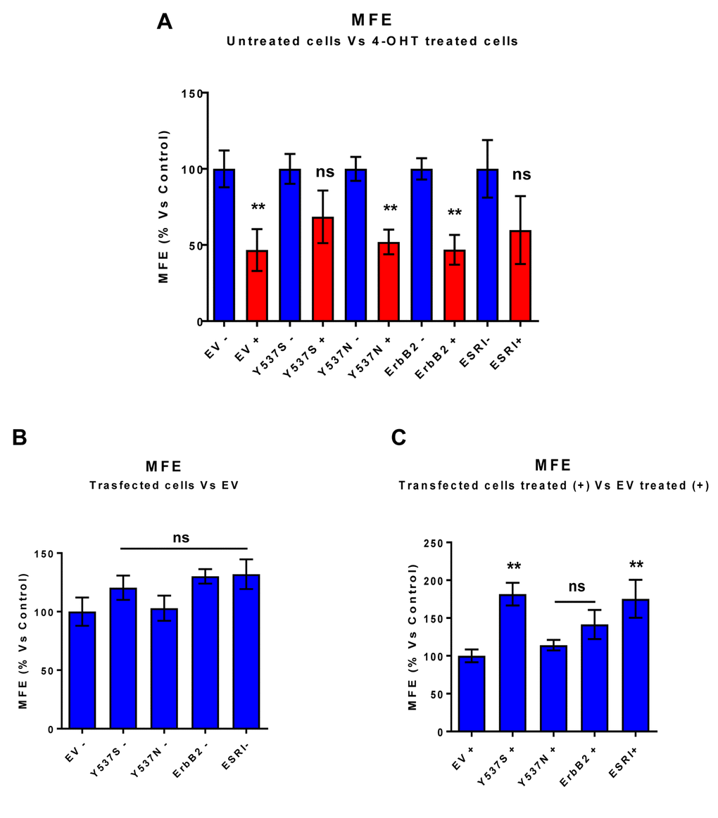 Briefly, MCF7 cells were transduced with a lentiviral vector carrying the Y537S mutation of ESR1 and positive “pools” of cells were selected, using a puromycin resistance cassette. Four other isogenic MCF7 cells lines were also generated in parallel, which served as negative controls for these experiments: ESR1 (WT and Y537N), ErbB2 and empty-vector (EV).