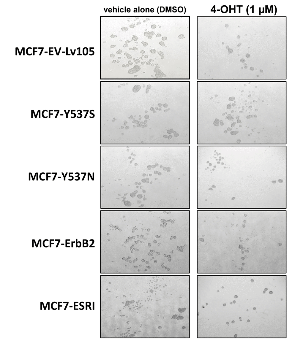 Somatic mutations of the human estrogen receptor alpha (ESR1) have been directly implicated in the pathogenesis of hormonal therapy resistance in human breast cancer patients [1,9]. However, the exact mechanism(s) by which these ESR1 mutations induce Tamoxifen-resistance remains largely unknown. To begin to dissect how these mutations phenotypically confer drug resistance, we chose to construct an in vitro genetic model, using MCF7 cells, an ER(+) breast cancer cell line.