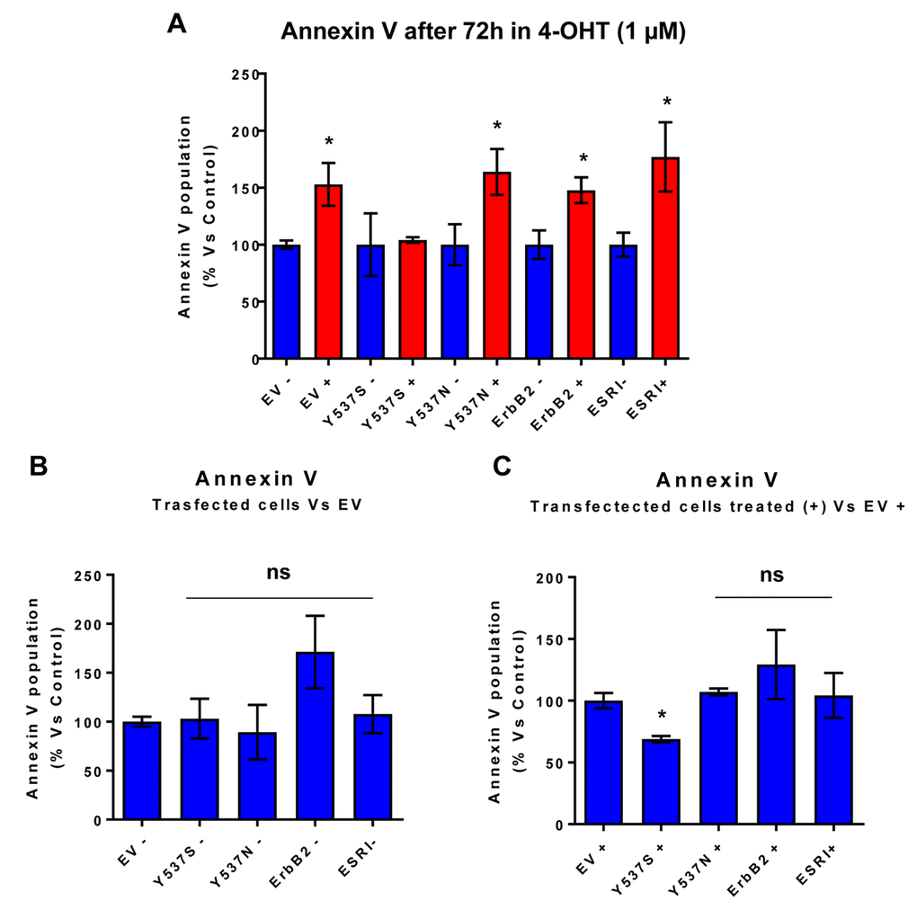 Cell death was quantified by flow cytometry using propidium iodide (PI) and Annexin V-FITC [16]. Briefly, 1,5 x 105 all the transfected cells were plated in 6 multiwell plate in complete media supplemented with 10% HiFBS. Next day, cells were treated with 1µM of 4-OH-Tamoxifen (4-OHT) for 48h and 72h. Vehicle alone (DMSO) for control cells were processed in parallel. After 48 hours, cells were harvested and washed in cold phosphate-buffered saline (PBS). Cells were recentrifuged and supernatants were discarded. Then, cells were re-suspended in 100 µl of annexin-binding buffer. Then, the annexin–FITC conjugate (5 μl) and PI (1 μL) were added and incubated in the dark at room temperature for 15 min. After the incubation period, reaction was stopped by adding 400 μL of annexin-binding buffer. Cells were then analyzed by flow cytometry using a PE Texas Red signal detector for PI staining and a FITC signal detector to detect Annexin V binding. 30,000 events were recorded by FACS using Fortessa BD. Results are the average of three experiments that were performed in triplicate, three times independently.