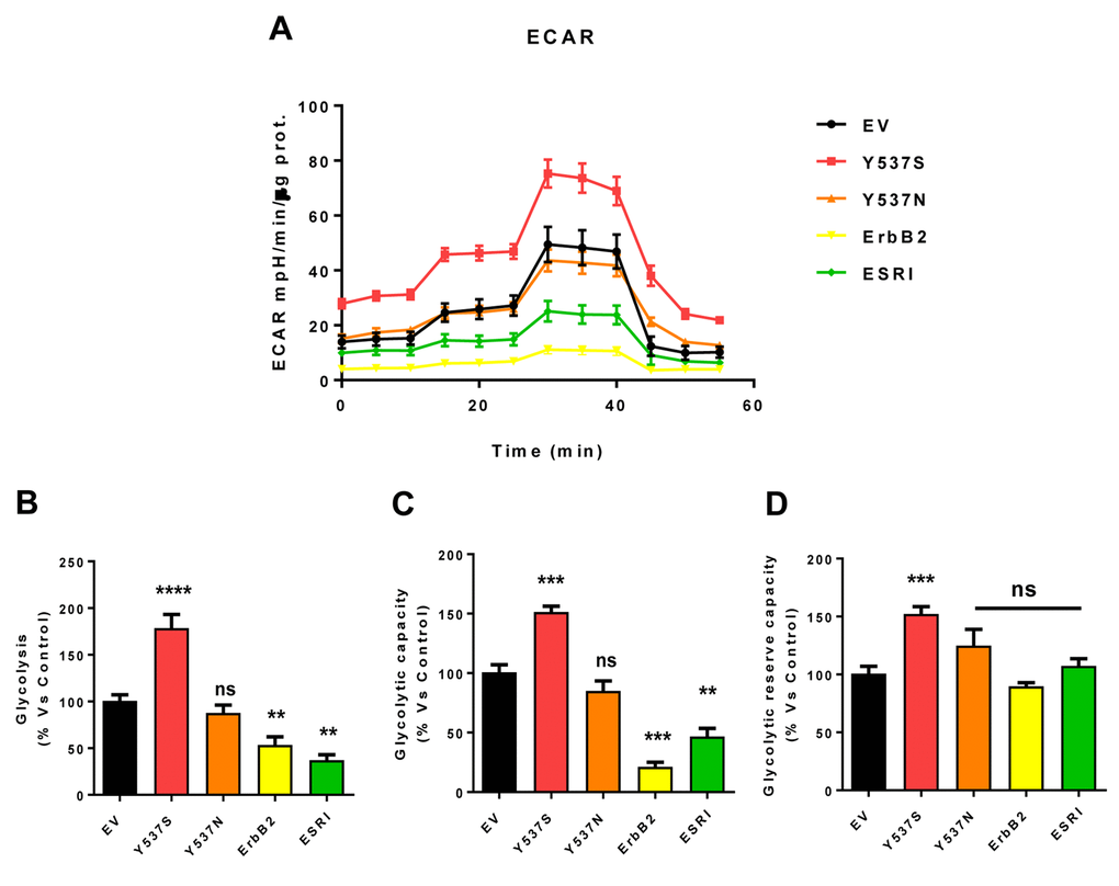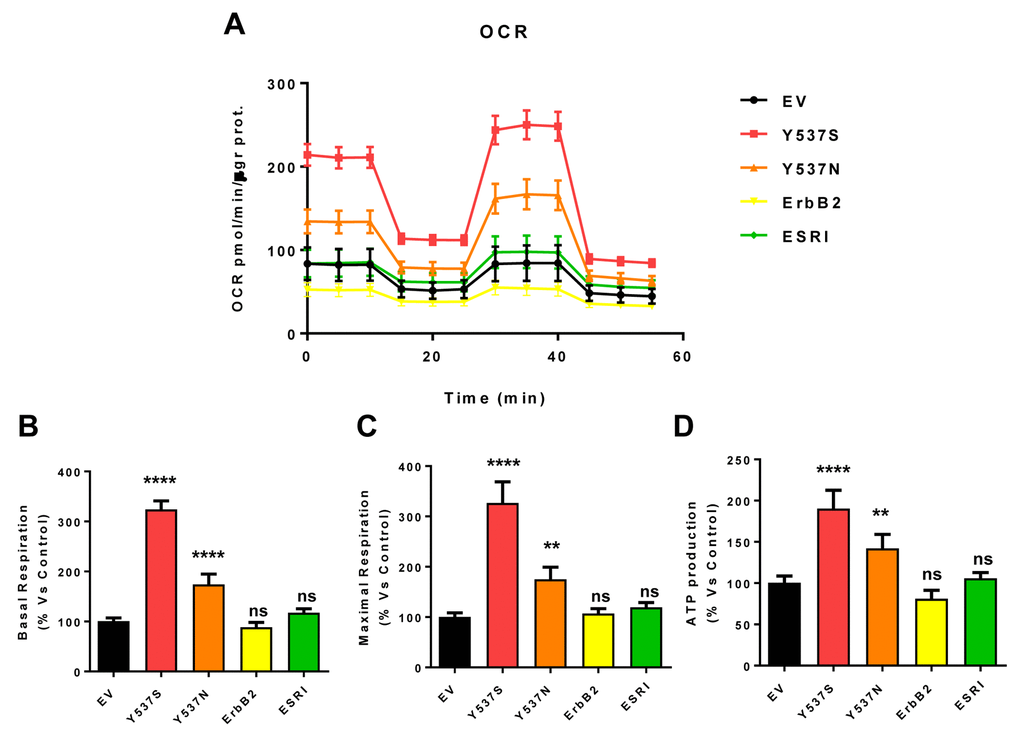 We also tested the hypothesis that the Y537S mutation confers an abnormal metabolic phenotype, reflecting a form of gene-induced metabolic re-programming. In particular, by using the Seahorse XFe96 metabolic flux analyser, we determined the effects of the Y537S mutation on the i) oxygen consumption rate (OCR) and ii) the extracellular acidification rate (ECAR), as well as ATP production. Interestingly, the Y537S mutation resulted in a hyper-metabolic state, accompanied by elevated rates of mitochondrial respiration, enhanced ATP levels and increased glycolysis. Consistent with these findings, the Y537S mutation also increased mitochondrial mass and membrane potential, likely reflecting an increase in mitochondrial biogenesis.
