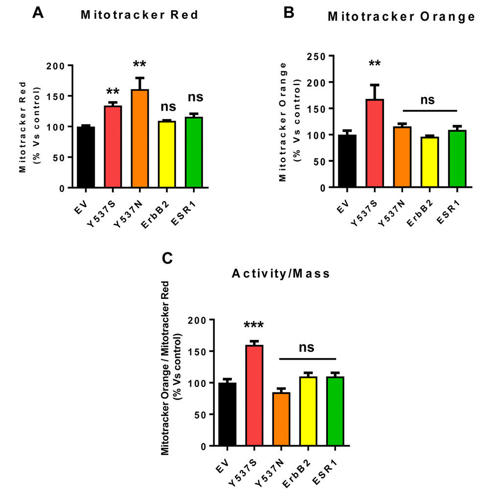 This elevated mitochondrial function may be due to increased mitochondrial biogenesis. Figure 8 illustrates that the Y537S mutation increases both mitochondrial mass and mitochondrial membrane potential, as observed by flow-cytometry with MitoTracker probes. This approach allowed us to calculate the activity/mass ratio, which was also increased in MCF7-Y537S cells.