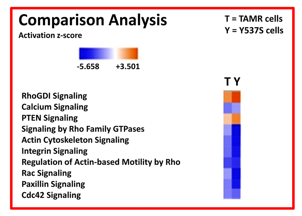Interestingly, the Y537S mutation was also linked to the over-expression of a number of protein markers of poor clinical outcome (TIGAR, COL6A3, ERBB2, STAT3, AFP, TFF1, CDK4, CD44). Ingenuity Pathway Analysis (IPA) independently demonstrated that the proteomic profile of MCF7-Y537S cells is very similar to MCF7-TAMR cells, another Tamoxifen-resistant cell line created by chronic exposure to Tamoxifen [17]. Both cell lines show the hyper-activation of a Rho-GDI/PTEN signaling pathway. These novel mechanism(s) driving Tamoxifen-resistance clearly have important implications for significantly improving clinical outcomes for breast cancer patients.