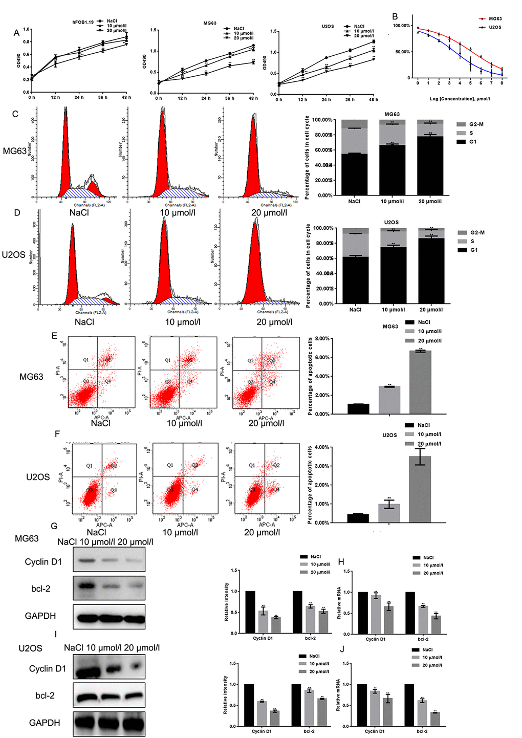 The MTT assay revealed that naringin treatment inhibited the proliferation of MG63 and U2OS cells in a concentration dependent manner (Fig. 2A). The inhibitory effect of naringin on the proliferation of hFOB1.19 was only obvious when the concentration of naringin was 20 μmol/L. The IC50 of naringin on MG63 and U2OS cells at 24 h was ~50 μmol/L and ~30 μmol/L, respectively (Fig. 2B). Next, we used flow cytometry to evaluate cell cycle staging in PI-stained MG63 and U2OS cells previously exposed to various concentrations of naringin for 24 h. Naringin induced a dose-dependent increase in the percentage of cells in G1 phase, and decreased the number of cells in S phase, compared to control (Figs. 2C, D). To assess whether naringin can promote apoptosis, flow cytometry was used in Annexin-V-FITC-stained osteosarcoma cells. Results showed a dose-dependent increase in apoptotic cells treated with naringin (Figs. 2E, F). In line with these antiproliferative and pro-apoptotic effects, both Western blot and real-time PCR assays showed that exposure to 10 or 20 μmol/L naringin for 24 h dramatically decreased the expression of Cyclin D1 and bcl-2 (Figs. 2G-J).