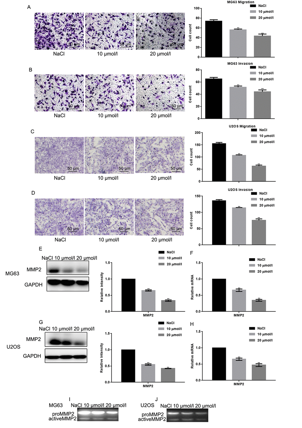 The effects of naringin on osteosarcoma cell migration and invasion was assessed using Transwell assays in the absence or presence, respectively, of Matrigel. Results showed that naringin exposure (10 or 20 μmol/L for 24 h) significantly decreased both migration and invasion of MG63 and U2OS cells in a dose-dependent manner (Figs. 3A-D). These effects were consistent with a decrease in MMP2 expression, detected in both cell lines in Western blot, real-time PCR, and zymography gel assays (Figs. 3E-H).