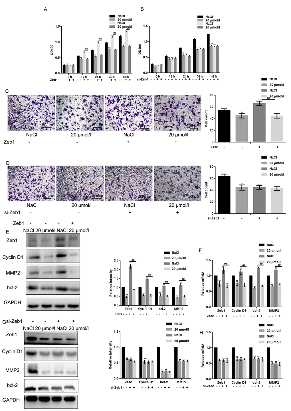 To test the hypothesis that naringin exerts antiproliferative and anti-invasive effects by inhibiting Zeb1, its effects were tested in MG63 cells transfected with a plasmid encoding Zeb1 (Zeb1 overexpression) or an empty vector backbone (control). Conversely, siRNAs were introduced to downregulate Zeb1 (si-Zeb1), and to serve as non-targeted, negative control (si-NC). MTT assays showed that proliferation was stimulated by Zeb1 overexpression, and decreased to control inhibition levels by naringin (20 μmol/L) (Fig. 4A). On the other hand, Zeb1 suppression, although partial, decreased cell proliferation, and naringin induced no further inhibition in these cells. (Fig. 4B). We next examined whether migration was affected in Zeb1-overexpressing and Zeb1-suppressed cells. Transwell assay results indicated that Zeb1 overexpression enhances the migration of MG63 cells, while Zeb1 silencing recapitulates the inhibitory effect of naringin on control cells (Figs. 4C, D). Finally, we analyzed the effects of Zeb1 overexpression and downregulation on Cyclin D1, MMP2, and bcl-2 expression. The results showed that expression of these proteins increased upon Zeb1 upregulation (Figs. 4 E-F). Meanwhile, Zeb1 silencing lowered protein expression to levels like those observed in naringin-treated control cells (Figs. 4 G-H).