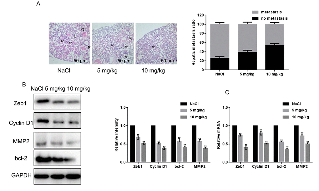 To examine the effect of naringin on osteosarcoma cell tumorigenesis in vivo, MG63 cells were injected into nude mice via the tail vein. After daily administration of naringin (5 or 10 mg/kg) or 0.9% NaCl for 16 days, mice were sacrificed and lung tissues processed for microscopic histological analysis. Results showed that naringin significantly prevented lung degeneration and reduced the incidence of metastatic nodules (Fig. 5A). Moreover, Western blots (Fig. 5B) and real-time PCR assays (Fig. 5C) showed that the expression of Zeb1, Cyclin D1, MMP2, and bcl-2 was decreased in the livers of mice treated with naringin.