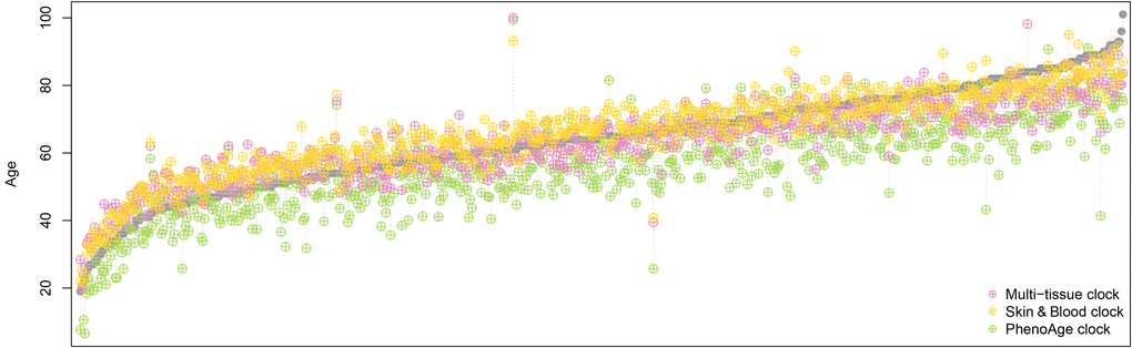 We observed similar results when we applied the Skin & Blood clock, the multi-tissue clock, and the PhenoAge clock to a dataset of 656 samples (age range 19 to 101 years) with which another highly accurate epigenetic age estimator for whole blood samples was developed by Hannum et al. [10] [of note, we did not include GrimAge in these comparisons, as GrimAge is supposed to be a predictor of mortality rather than an age predictor and takes (chronological) age itself as input, together with sex and DNA methylation measurements]. The Skin & Blood clock exhibited the least error and the best correlation with chronological age (see Table 1 and Figure 1), confirming its improved performance in chronological age prediction.