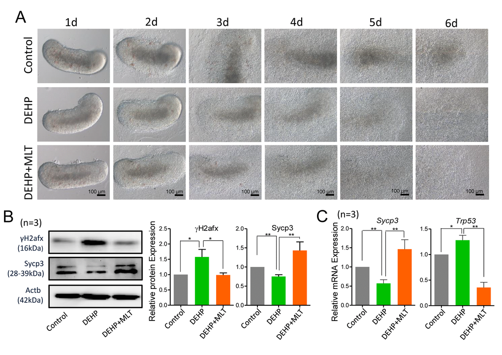 To examine whether MLT can rescue the DEHP-induced meiotic defect, based on our previous study, we treated DEHP-exposed fetal mouse ovaries with a dose of 1 μM MLT [35]. Expectedly, MLT significantly increased the level of Sycp3 and reduced the level of γH2afx protein, consistent with the mRNA levels of Sycp3 and Trp53 compared with that of DEHP treatment group (Figures 1B and 1C; P < 0.05 or P < 0.01). Similarly, there were no morphological differences between the DEHP+MLT group and the DEHP group (Figure 1A).