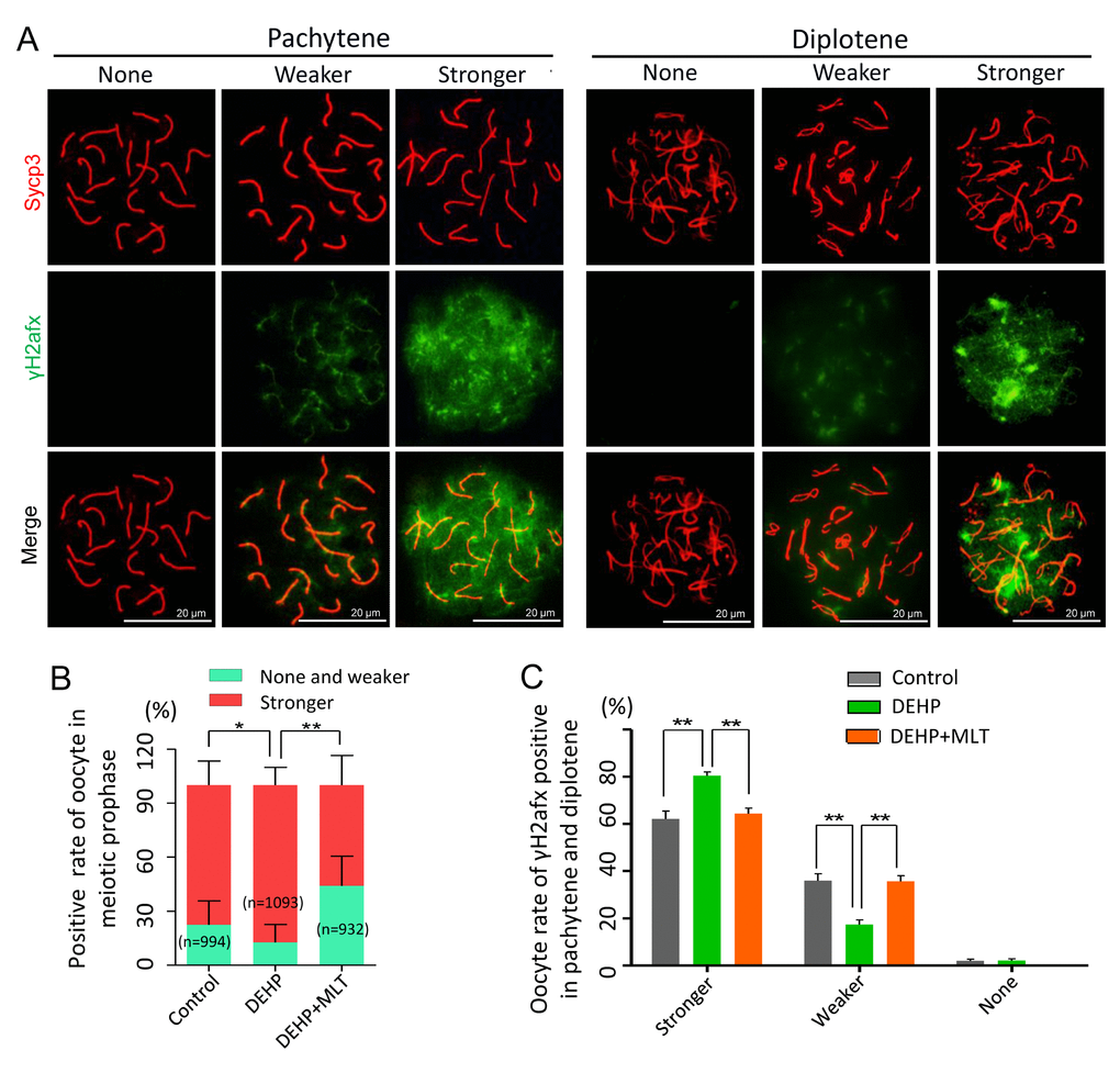 To further prove the reliability of the results, we double stained oocyte cytospreads for Sycp3 and γH2afx (Figure 2A). The expression pattern of γH2afx in oocytes could be classified into three main categories: none (negative or rare barely detectable foci), weaker (a few patches and less than 50% area) and stronger (numerous small and large patches, more than 50% area) [36,37]. Statistical analysis at all MPI stages indicated that the percentage of oocytes with a stronger staining pattern of γH2afx significantly increased in the DEHP treated group (87.24 ± 4.02%) compared with that of the control group (77.60 ± 5.04%) (P < 0.05), but that was much lower in the DEHP+MLT treated group (56.03 ± 9.52%) (Figure 2B; P < 0.01). Since most oocytes were in the pachytene and diplotene at 18.5 dpc, for purpose of studying the expression of γH2afx in oocytes, we further separately classified them into three categories. Similarly, the percentage of stronger γH2afx oocyte in DEHP + MLT group (64.36 ± 2.39%) is closer to control group (62.13 ± 3.37%), and much higher in DEHP group (80.48 ± 1.53%) (Figure 2C; P < 0.01).
