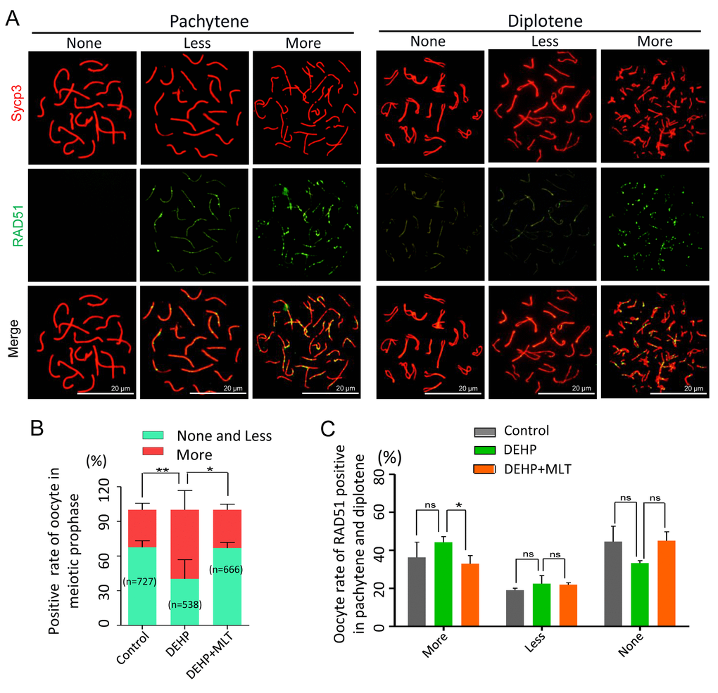 As the repair of meiotic DSBs is crucial for HR and crossover formation, we then performed chromosome staining for the proteins RAD51 and Sycp3 (Figure 3A). The RAD51 staining pattern of meiotic oocytes was classified into three categories: none (negative), less (numbers of RAD51-positive foci ≤ 10 in each oocyte) and more (numbers of RAD51-positive foci > 10 in each oocyte) according to previous studies [38,39]. The statistical results at all MPI stages showed the percentage of positive-cells with more RAD51 signal in the DEHP group (59.83 ± 7.44%) was significantly higher than that of the control group (32.48 ± 2.54%) (Figure 3B; P < 0.01). Meanwhile, compared with the DEHP treated group, the proportions of RAD51 positive-cells in the DEHP+MLT group (33.13 ± 2.79%) was decreased (Figure 3B; P < 0.05). Likewise, there were not significant differences between the control (36.27 ± 8.02%) and DEHP + MLT (32.97 ± 4.27%) group in terms of the percentage of positive oocytes with more RAD51 signal at pachytene and diplotene stage, but the rate was increased in DEHP group (44.24 ± 2.98%) (Figure 3C).