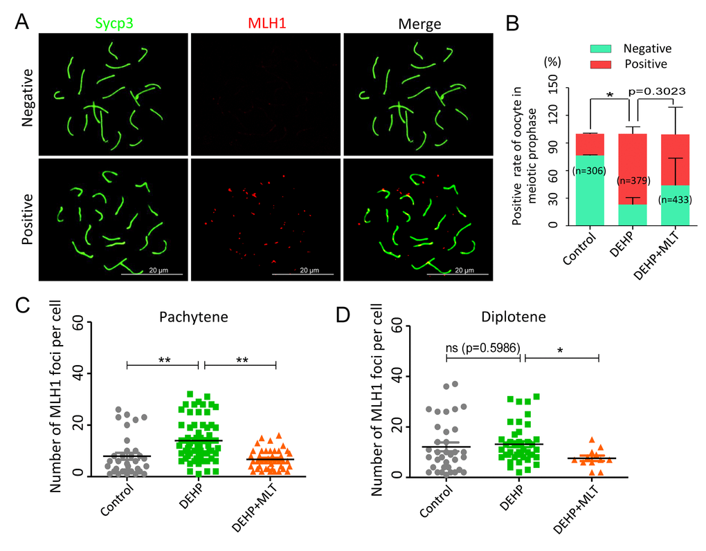 Generally, successful mismatch repair is a conserved DNA repair pathway and plays a crucial role in meiotic crossover and DNA recombination. MLH1 facilitates both mismatch repair and crossover during meiosis [40]. To verify the effect of MLT on mismatch repair in the germ cells following DEHP exposure, MLH1 staining was carried out to identify the sites of exchange (Figure 4A). Based on the results of the statistical analysis, DEHP exposure significantly increased the rate of MLH1 positive oocytes (77.01 ± 4.41% vs 23.63 ± 0.55%, P < 0.05), and this increase had no significant improvement when MLT was added with DEHP (55.04 ± 17.04%) (Figure 4B). The average number of MLH1 foci in per cell showed the MLH1 foci number of oocytes at pachytene with DEHP exposure dramatically increased (13.97 ± 0.95) when compared to the control group (7.91 ± 1.33) and deceased in the presence of MLT (6.74 ± 0.58) (Figure 4C; P < 0.01). However, after MLT-administrated, the average number of MLH1 foci in per cell at diplotene (7.58 ± 1.07) was significantly decreased when compared to the DEHP treated group (13.18 ± 1.16) (P < 0.05), although there were not significant changed in control group (12.11 ± 1.74) compared to the DEHP group (Figure 4D). Collectively, these data indicated that DEHP exposure of fetal oocytes would affect the expression of MLH1, which might be one of the critical factors leading to the failure of mismatch repair. As expected, MLT alleviates mismatch repair abnormalities by influencing the level of MLH1.