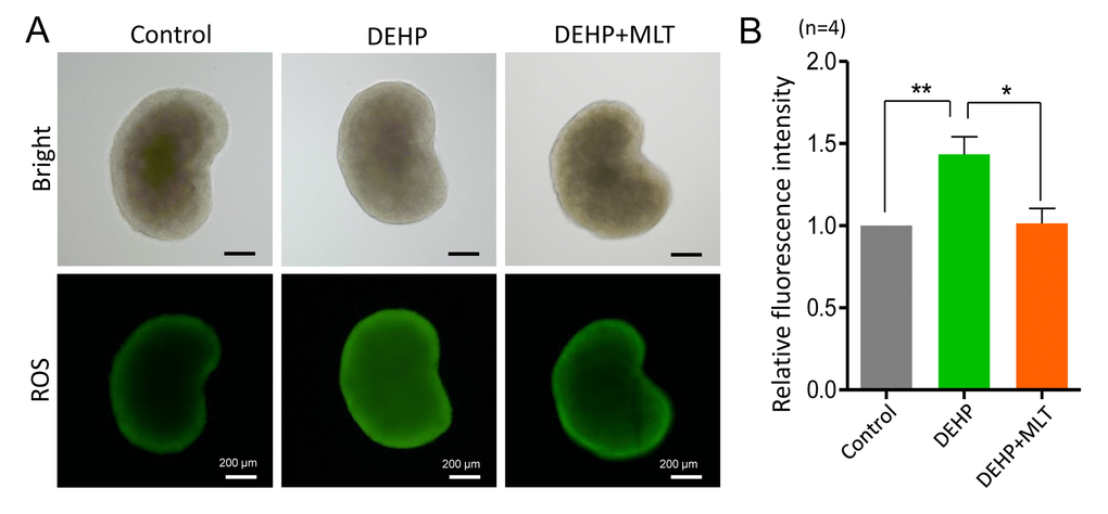 Based on previous studies [34,41], we hypothesized that DEHP exposure would induce oxidative stress which would be accompanied by apoptosis in fetal oocytes. This would lead to the deterioration of critical regulators and events during oocyte meiosis. To confirm this assumption, we assessed the level of ROS in the control, DEHP, and DEHP+MLT groups (Figure 5A). In the DEHP treatment group, the fluorescent intensity of ROS was significantly increased compared to that of the control group (P < 0.01), while following the administration of MLT, ROS generation reduced dramatically (Figure 5B; P < 0.05).