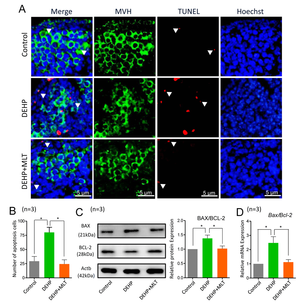 Next, we detected the apoptotic signals by TUNEL-staining in different groups. The results showed that apoptosis was hardly detected in control ovaries, but clearly existed in the DEHP-exposed group (Figure 6A). The number of TUNEL-positive cells was dramatically higher in the DEHP group when compared with that of the control group (P < 0.05) but was reduced in the DEHP+MLT group (Figure 6B; P < 0.05). Additionally, we further evaluated whether MLT influenced the expression levels of apoptotic proteins and genes, including BAX and the anti-apoptotic protein BCL-2. As expected, the ratios of BAX/BCL-2 proteins were significantly increased in the DEHP treated group compared with that of the control group (Figure 6C, P < 0.05), however, the administration of MLT restored the protein levels (P < 0.05). This observation was consistent with the gene levels (Figure 6D; P < 0.05).