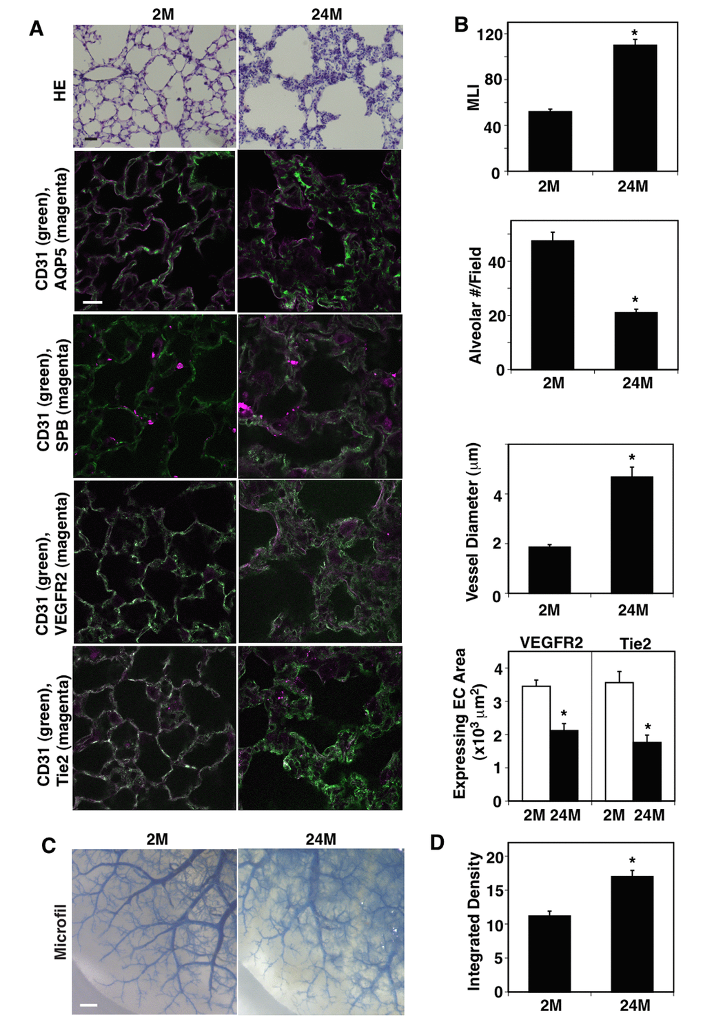 When we examined vascular and alveolar structures in the young (2 months (2M) old) vs. aged mouse lungs (24M old) using histological (hematoxylin & eosin (H&E) staining) and immunohistochemical (IHC) analyses, the structure of aquaporin 5 (AQP5)- and surfactant protein-B (SPB)-positive alveolar units (septation) and CD31-positive blood vessel structures in the septa were disrupted in 24M old mouse lungs compared to those in 2M old mice (Figure 1A); alveolar size characterized by measuring the mean linear intercept (MLI) was 2.1-times higher, while the alveolar number was 57% lower in the 24M old mouse lungs compared to those in the 2M old mouse lungs (Figure 1B). Although vascular density was not significantly changed in the alveolar septa, vessel diameter was 2.5-times larger and the expression of major angiogenic factor receptors, VEGFR2 and Tie2, in ECs decreased by 39% and 49%, respectively, in the 24M old mouse lungs compared to those in the 2M old mouse lungs (Figure 1B). We also analyzed the age-dependent effects on blood vessel structures using the microfil casting system (Figure 1C). The casting reagents that leaked out of the blood vessels increased by 1.5-fold in the 24M old mouse lungs compared to those in the 2M old mouse lungs (Figure 1C, D).