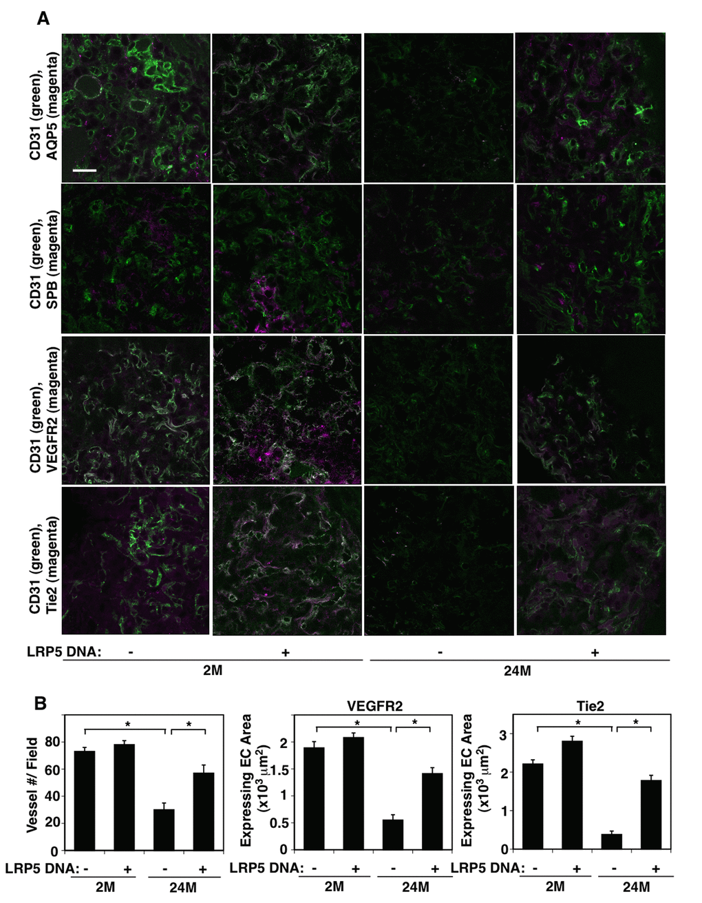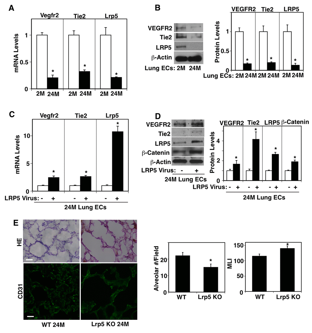 In this report, we have demonstrated that vascular and alveolar structures are disrupted in the 24M old mouse lungs. The expression of LRP5 and major angiogenic factor receptors, VEGFR2 and Tie2, was lower in ECs isolated from 24M old mouse lungs compared to those from 2M old mouse lungs. Vascular and alveolar formation was suppressed in the fibrin gel implanted on the 24M old mouse lungs and compensatory lung growth after PNX was inhibited in 24M old mice, while these effects were restored by overexpression of LRP5. These results suggest that age-dependent decline in LRP5 expression decreases the expression of angiogenic factor receptors and impairs angiogenesis and alveolar morphogenesis in the aged mouse lungs. Modulation of LRP5 expression may be one of the promising strategies for age-related lung diseases and delaying the aging processes in the lungs.