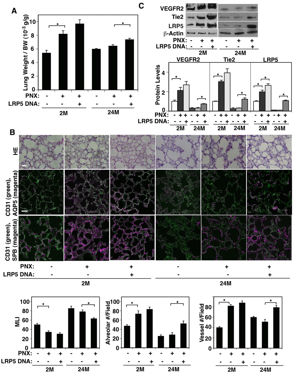 Wnt signaling plays important roles in lung vascular and alveolar development [13–17]. Wnt signaling is suppressed in aging organs including lungs [18] and activated Wnt signaling inhibits cellular senescence [18–20]. Reduced Wnt signaling is associated with aging-associated diseases such as heart disease [21], Alzheimer’s disease [22], osteoporosis [23], diabetes [24], and COPD [1,25,26]. We and other groups have shown that the Wnt ligand co-receptor, low-density lipoprotein receptor-related protein 5 (LRP5) controls various angiogenic pathways (e.g., angiopoietins (Angs)-Tie2 [15,17], VEGF-VEGFR2 [27,28], neuropilin (NRP2) [29]), and stimulates retinal [27,30–32] and lung vascular development in neonatal mice [14–17]. LRP5 also mediates compensatory lung growth after PNX in young adult mice through Ang-Tie2 signaling [33]. Thus, LRP5 signaling may be the key control point for the impairment of vascular and alveolar morphogenesis in the aged lung.