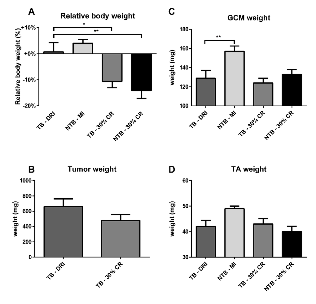 All animals were sacrificed at 21 days following tumor inoculation, i.e. 35 days after onset of the experiment. At sacrifice, the final decrease in bodyweight was greatest in TB 30% CR and NTB 30% CR mice, 10.5% and 14.0% respectively (Figure 4A). As expected, NTB MI mice had an increase in body weight of 4.0%. TB DRI mice experienced a rapid decline in body weight in the final days preceding sacrifice by 10.6%. Tumor mass increased until day 21, when resected mean tumor weight was 662 ± 316 mg in TB DRI mice versus 480 ± 249 mg in TB 30% CR mice. This trend towards reduced tumor growth in CR mice was not significant (p = 0.17) (Figure 4B). Furthermore, no association between tumor weight and body weight loss was observed. Directly following sacrifice, the gastrocnemius and tibialis anterior muscles were resected and weighed. Mean gastrocnemius muscle weight in NTB MI mice was 158.3 ± 18.3 mg versus 128.7 ± 25.3 mg in TB DRI mice, p = 0.008 (Figure 4C). Mean gastrocnemius muscle weight for C26 TB 30% CR mice was 124.4 ± 15.5 mg, comparable to C26 TB DRI mice (p > 0.99). Similarly, mean gastrocnemius muscle weights for NTB 30% CR mice were 132.5 ± 15.4 mg, comparable to C26 TB DRI mice (p > 0.99). Mean tibialis anterior muscle weight in NTB MI mice was 48.9 ± 3.4 mg versus 42.1 ± 8.5 mg in the C26 TB DRI mice (p = 0.08) (Figure 4D). Mean tibialis anterior muscle weights for C26 TB 30% CR mice were 42.6 ± 5.4 mg, comparable to C26 TB DRI mice (p > 0.99). Similarly, mean tibialis anterior muscle weights for NTB 30% CR mice were 40.0 ± 4.9 mg, comparable to C26 TB DRI mice (p > 0.99).