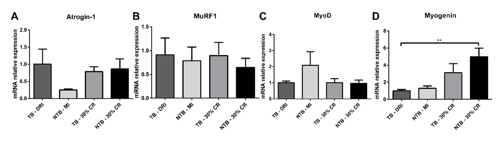 Skeletal muscle E3 ubiquitin ligases and myogenic regulatory factors mRNA expression profiles were determined in gastrocnemius muscle samples. A substantial, non-significant difference in E3 ubiquitin ligase atrogin-1 expression was observed between C26 TB DRI and NTB MI (Figure 5A). No difference was observed between C26 TB DRI, C26 TB 30% CR and NTB 30% CR. Expression of the second E3 ubiquitin ligase MuRF1 and myogenic regulatory factor MyoD were comparable between all four groups (Figure 5B, 5C). Finally, and perhaps most interesting, there was increased expression of the myogenic regulatory factor myogenin in the NTB 30% CR group (p = 0.002) as well as a substantial, non-significant elevation in the TB 30% CR group (Figure 5D).
