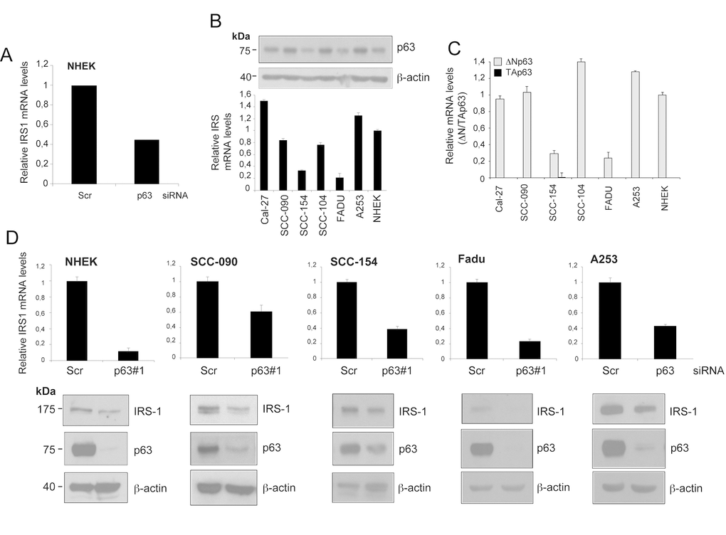 By exploiting RNA sequencing (RNA-seq) transcriptome profiling, we identified genes regulated by ΔNp63 in normal human epidermal keratinocytes (NHEKs) (E.C. unpublished data). The analysis of RNA-Seq data obtained from p63-depleted cells revealed almost 50% reduction in IRS1 expression levels relatively to control cells (Fig. 1A). We then sought to test whether IRS1 expression is regulated by p63 in HNSCC cells. HNSCC cell lines display moderate/high levels of p63 expression (Fig. 1B, upper panel). In particular, the predominantly expressed isoform of p63 in HNSCC cells is ΔNp63, with TAp63 being undetectable in the majority of the cell lines (Fig. 1C). We observed a consistent correlation between ΔNp63 protein levels and the gene expression pattern of IRS1 in most of the HNSCC cell lines analysed (Fig. 1B, lower panel). Validation of RNA-seq data showed that, following p63 knockdown, IRS1 transcript and protein levels were reduced in NHEK and in a panel of HNSCC cell lines (Fig. 1D).