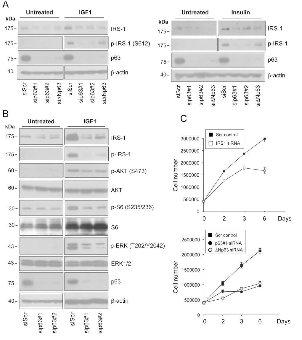 Notably, the existence of a possible crosstalk between p63 and the IGF system has been reported. The tumour suppressive TAp63 isoforms negatively control Igf1r transcription [85], whereas Igfbp3 is a target of transcriptional repression by ΔNp63 [86]. Here we report, that Np63 affects the transcription and the cellular abundance of Irs1 in HNSCC cells and, that, as a result, p63 down-regulation impairs the activation of the intracellular signalling pathways following IGF1R stimulation.