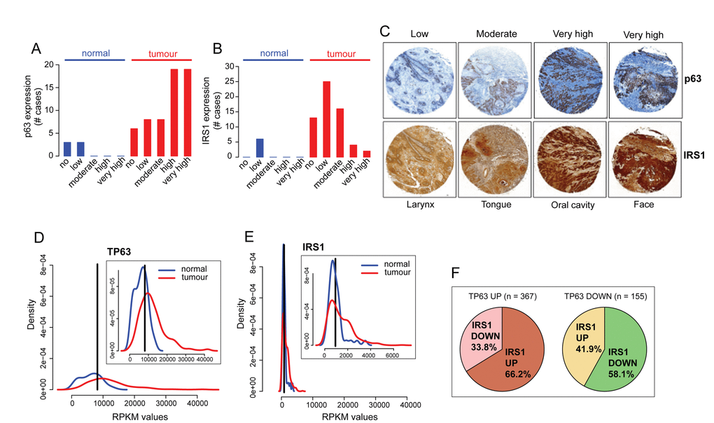 RPKM distributions for each of the genes of interest have been analyzed either for tumor and normal samples in the HNSC cohort. A discrimination cutpoint between tumor and normal expression distributions either for TP63 and IRS1 has been detected using OptimalCutpoints R package [97]. The identified optimal cutoffs represent the RPKM values that maximize the separation of gene expression distributions in tumor and normal samples. Data mining, statistical tests (Wilcoxon and Fisher’s exact tests) and plots on TCGA gene expression data were performed in R.