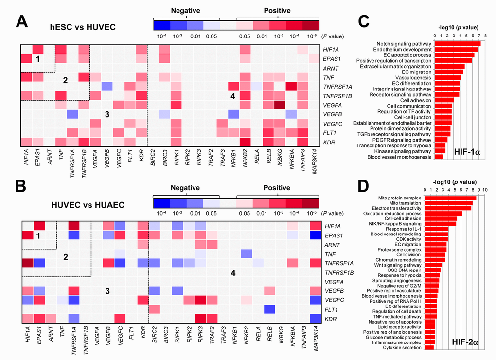 To examine the differences between HIF-1α- and HIF-2α-related genes in ECs, the gene ontology (GO) analysis was then performed to classify the genes whose expression correlated with either HIF1A or EPAS1 in both arterial and venous ECs from diverse locations, including cultured ECs of aorta, coronary artery, hepatic artery and vein, iliac artery and vein, pulmonary artery and vein, umbilical artery and vein, as well as freshly isolated ECs of umbilical artery and vein (Normal Endothelial Cells HUAEC/HUVEC - Luttun - 38 - MAS5.0 - u133p2) [29]. Notably, the most significant HIF1A- and EPAS1-correlated genes fell into two functionally distinct repertoires. The HIF1A-related genes were more relevant to EC development and angiogenesis (Figure 1C), while the EPAS1-related genes were however associated more with mitochondrial energy metabolism that is known to be required for HIF activation [30], blood vessel remodeling, inflammatory responses, etc. (Figure 1D). Together, these results support a notion that although both HIF-1α and HIF-2α play functional roles in promoting angiogenesis, they might function via activation of the distinct sets of target genes.