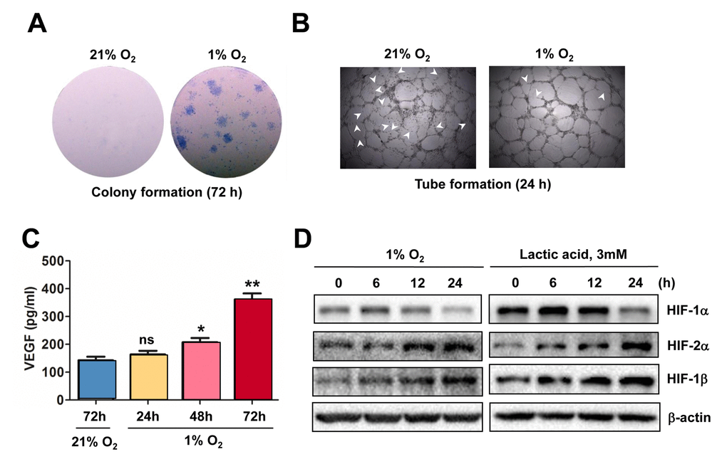 To confirm the causal link between HIF activation and angiogenesis in response to hypoxia, the colony formation assay was first performed to examine the effect of hypoxia on proliferation of ECs. As shown in Figure 2A, culturing HUVECs under 1% O2 condition led to a sharp increase in both number and size of colonies, compared to 21% O2 as control. Moreover, exposure of HUVECs to 1% O2 also enhanced their tube-forming capacity, reflected by fine vascular network with less unclosed loops (arrowhead; Figure 2B). Further, an ELISA assay was carried out to determine the amount of VEGF secreted by ECs. As shown in Figure 2C, exposure to 1% O2 resulted in an increase in VEGF production by HUVECs in a time-dependent manner. Moreover, Western blot analysis revealed that exposure to 1% O2 also resulted in a time-dependent increase in the protein levels of HIF-1α, HIF-2α, and HIF-1β (Figure 2D, left), and analogous results were obtained when lactic acid was utilized to mimic hypoxia (right). Therefore, these results indicate that hypoxia promotes angiogenesis via autocrine of VEGF by ECs, an event in association with HIF activation.