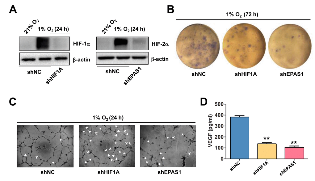 Knockdown of either HIF-1α or HIF-2α prevents hypoxia-induced VEGF production and angiogenesis