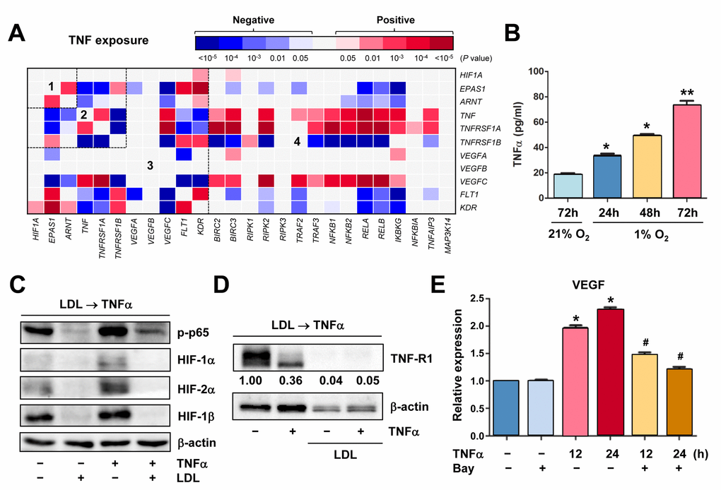 Because the GEP analyses showed that TNF was up-regulated in ECs under certain circumstances (e.g., Figures 1A and 5A), we thus examine whether hypoxia would induce production of TNFα by ECs. Indeed, an ELISA assay revealed that hypoxia induced a marked increase in production of TNFα by HUVECs in a time-dependent manner (Figure 5B). In turn, treatment with TNFα sharply induced NF-κB activation (e.g., p65 phosphorylation) and HIF-1β expression, in association with up-regulation of HIF-2α and to a lesser extent HIF-1α (Figure 5C, lane 3 vs 1). These results suggest an autocrine loop of TNFα in ECs under hypoxic conditions. However, pre-treatment with LDL almost completely eliminated both basal and TNFα-induced NF-κB activation and expression of all three HIF subunits (Figure 5C, lane 2 vs 1 and 4 vs 3, respectively). Moreover, although LDL failed to reduce, rather increased, TNFα production by ECs (Supplementary Figure S5C), it sharply down-regulated TNF-R1 that preferentially accounts for TNFα-induced NF-κB activation [39], in the presence or absence of TNFα (Figure 5D). Interestingly, it was noted that exposure of ECs to TNFα also clearly reduced TNF-R1, presumably reflecting a negative feedback response to TNFα stimulation via an unknown mechanism. Last, exposure to TNFα induced expression of VEGF in HUVECs, an event significantly blocked by the NF-κB inhibitor Bay 11-7082 [40] (Figure 5E). Together, these findings argue that hypoxia might induce angiogenesis via an autocrine loop of TNFα in ECs, which involves VEGF production via activation of the HIF and NF-κB pathways. They also raise a possibility that LDL impairs hypoxia-induced angiogenesis by interfering with this signaling network in ECs, primarily due to down-regulation of TNF receptors (e.g., TNF-R1), rather than TNFα.