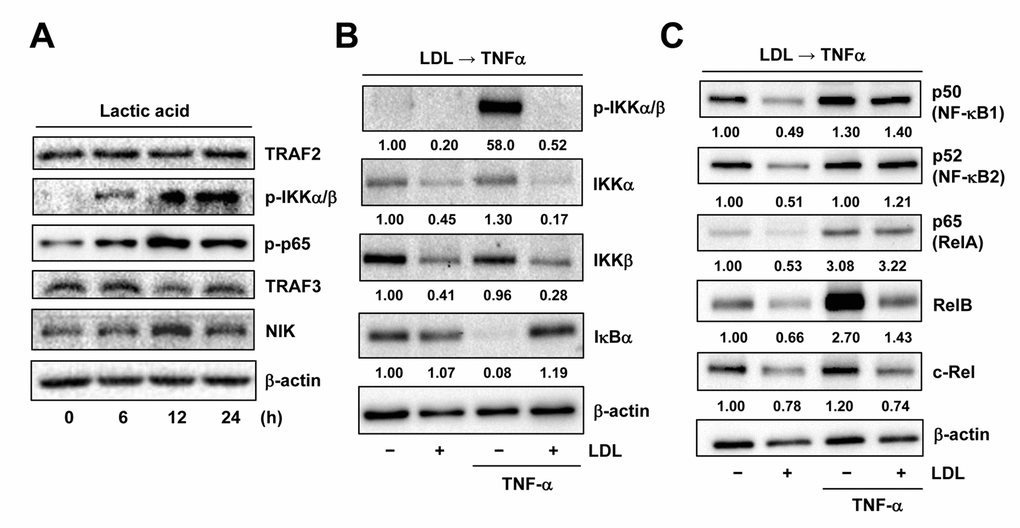As LDL was able to disrupt the autocrine loop of TNFα likely via down-regulation of TNF-R1, a question then arose how LDL would act to down-regulate TNF-R1. As described above, expression of TNFRSF1A (encoding TNF-R1) significantly correlated with activation of NF-κB, rather than HIFs, in ECs exposed to TNFα (Figure 5A). In this context, the effect of LDL on expression of the key components involving the canonical and non-canonical NF-κB pathways was then examined. Similar to that we previously observed in ECs exposed to 1% O2 [18], the chemical mimetic lactic acid could also activate the canonical NF-κB pathway in HUVECs, reflected by increased phosphorylation of IKKα/β and p65 [32], without affecting TRAF2 protein level (Figure 6A, upper panels). However, exposure to the PHD inhibitors (e.g., DMOG, CoCl2), which mimic hypoxia by causing accumulation of HIF-1α or HIF-2α due to prevention of their hydroxylation and proteasomal degradation [2], failed to induce NF-κB activation (data not shown). These results suggest that lactic acid might represent an alternative approach to mimic hypoxia more appropriately, in order to evaluate the cross-talk between HIF and NF-κB signaling pathways. Whereas TRAF3 is known to bind to NIK and lead to its ubiquitination and proteasomal degradation [32], we observed that lactic acid also reduced TRAF3 but increased NIK, reflecting activation of the non-canonical NF-κB pathway in HUVECs (Figure 6A, lower panels). Similarly, exposure to TNFα also resulted in a sharp increase in phosphorylation of IKKα/β (Figure 6B) as well as up-regulated RelB (Figure 6C) that binds to NF-κB2/p52 to activate the non-canonical NF-κB pathway [19]. Of note, pretreatment with LDL down-regulated the basal levels of multiple key components involving these two NF-κB pathways, including IKKα/IKKβ, p50, p52, p65 (RelA), RelB and c-Rel. LDL pretreatment also blocked TNFα-induced IKKα/β phosphorylation and RelB up-regulation, as well as down-regulated IKKα/IKKβ, RelB and c-Rel in HUVECs exposed to TNFα, while reversed down-regulation of IκBα by TNFα. Interestingly, LDL barely reduced the protein levels of p50, p52 and p65 in the presence of TNFα (Figures 6B and 6C). Together, these results suggest that in addition to down-regulation of TNF-R1, LDL might also disrupt the autocrine loop of TNFα in ECs by inactivating both canonical and non-canonical NF-κB pathways via down-regulation of their key components.