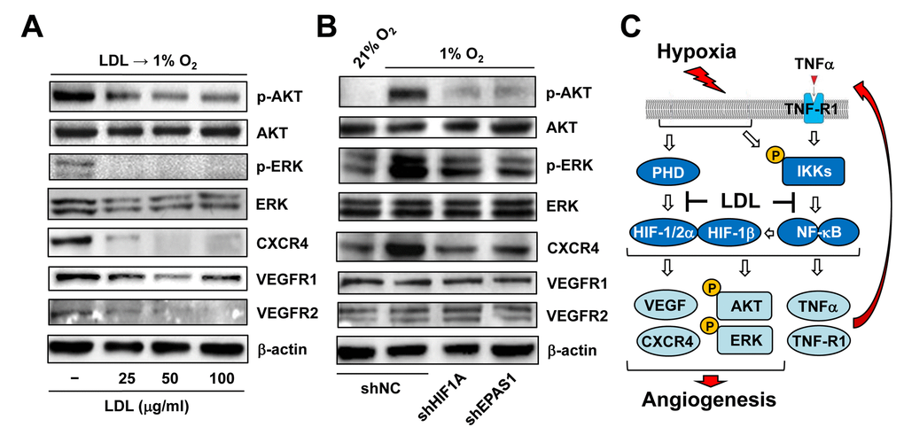 Last, we sought to find out potential downstream events of HIFs responsible for anti-angiogenic activity of LDL. To this end, the effect of LDL on major targets and pathways that are known to be involved in angiogenesis was examined in ECs exposed to hypoxia. As shown in Figure 7A, pre-treatment with LDL sharply reduces phosphorylation (activation) of AKT and ERK1/2, as well as expression of VEGF receptors (e.g., VEGFR1 and VEGFR2) and CXCR4 in HUVECs cultured under 1% O2. HUVECs with knockdown of HIF1A or EPAS1 were then utilized to determine whether disruption of the HIF pathway would reproduce these effects of LDL. Indeed, prevention of either HIF-1α or HIF-2α expression (Figure 3A) also markedly diminished activation of both AKT and ERK1/2, as well as CXCR4 expression induced by hypoxia (Figure 7B, upper panels). However, they failed to affect the protein levels of VEGFR1 and VEGFR2 (Figure 7B, lower panels). Together, these findings argue that the mechanism by which LDL impairs hypoxia-induced angiogenesis via inactivation of the TNFα/NF-κB/HIF/VEGF signaling network might involve a broad spectrum of HIF-dependent downstream events in ECs.