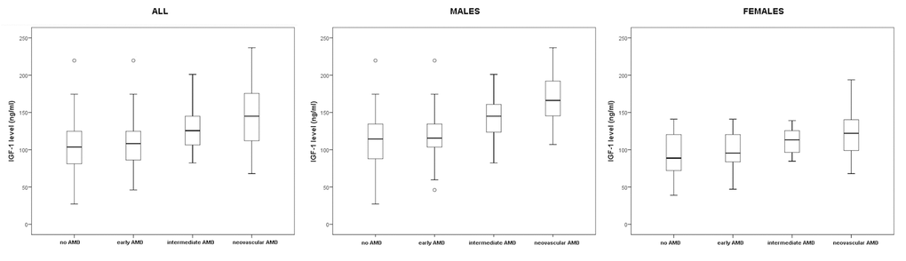 The present study was therefore designed to evaluate the circulating IGF-1 levels in early, intermediate, and neovascular AMD patients in comparison to healthy matched controls.
