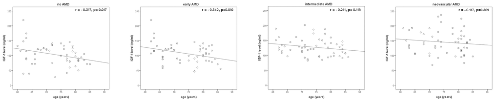 A significant correlation was found between mean IGF-1 values and age in early AMD group (r=-0. 342, p=0.010) and no AMD group (r=-0.317, p=0.017), but no significant in neovascular AMD group (r=-0.117, p=0.389) and intermediate AMD (r=-0. 211, p=0.118), Figure 2.