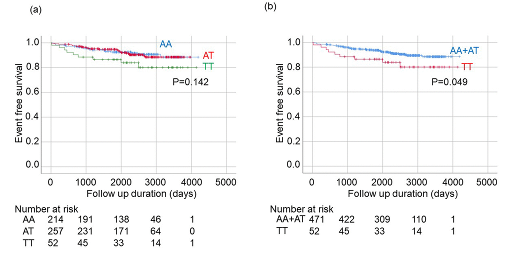 A Kaplan-Meier analysis for onset of stroke among patients with three genotypes (AA vs AT vs TT) suggested that stroke occurred more frequently in subjects with a TT genotype, but differences among groups were not significant (Figure 1a). A similar analysis between two groups (AA+AT vs TT) did indicate a significantly higher incidence of stroke in patients with a TT genotype than in patients with AA or AT genotypes (p=0.049; Logrank) (Figure 1b).